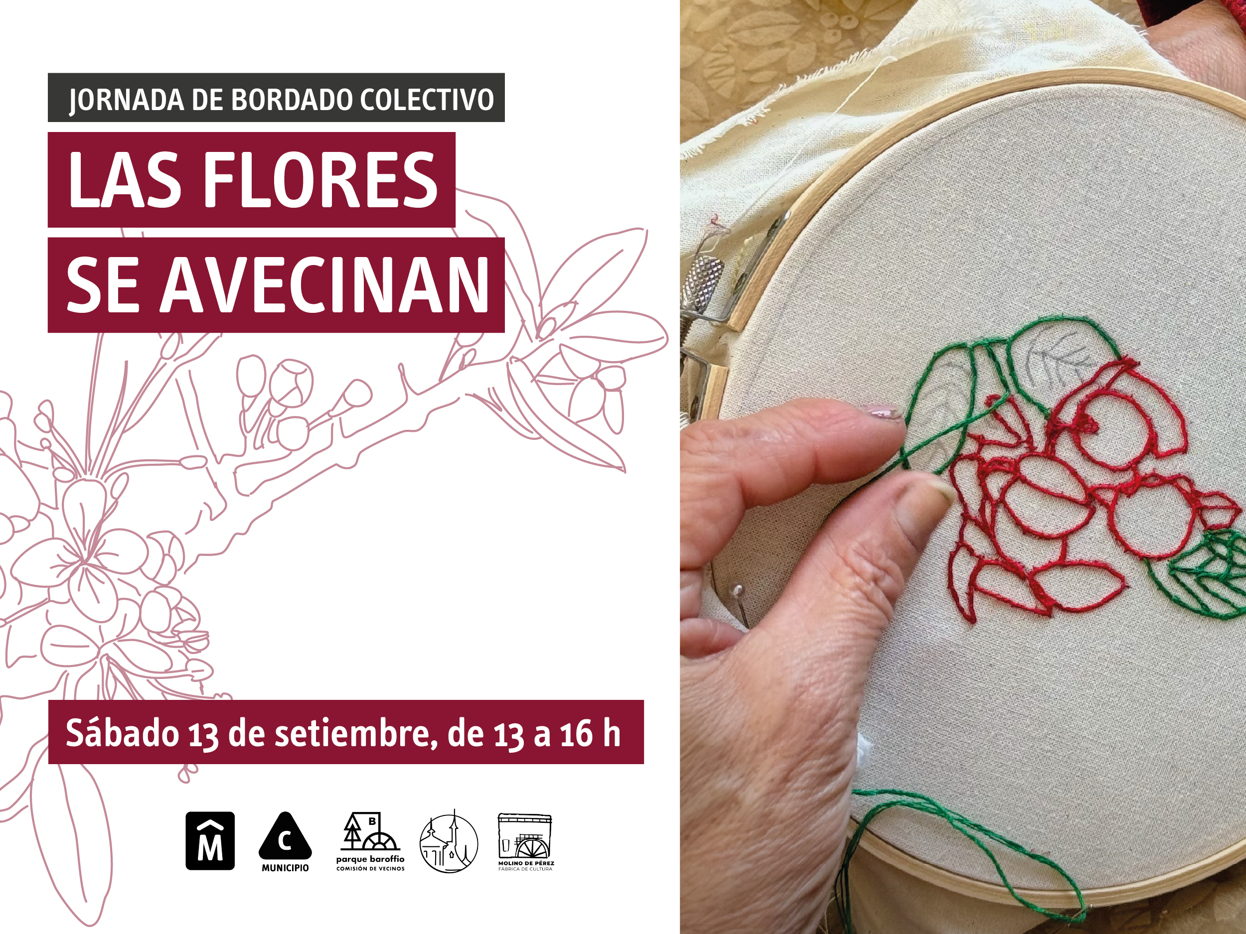 13:00 a 16:00 Hs. - Jornada de bordado colectivo " Las flores se avecinan" - A cargo de Centro de desarrollo cultural, turístico y económico" - Materiales incluídos, o puedes traer tus propias herramientas